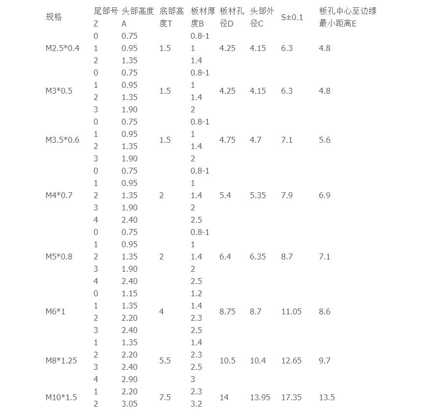 3.適用于各種厚度的板材,Zui小厚度0.8mm,使用時必須根據板材厚度和螺母規格,才能確定A尺寸對應的尾部號Z,用戶根據板材厚度依據表中尾部號選樣訂貨;
