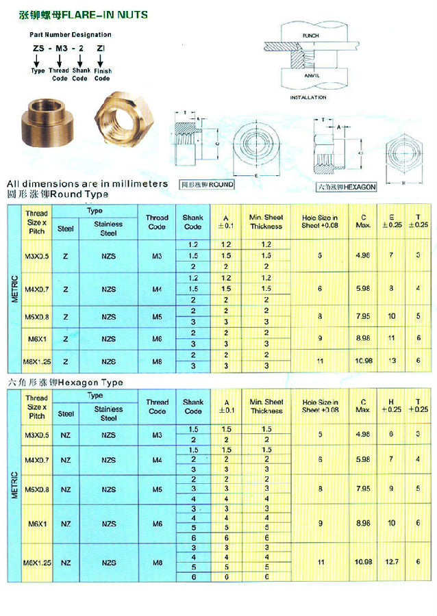 漲鉚螺母(型號:Z(ZS)/NZ(NZS))具有圓形和六角頭兩種,螺紋尺寸M3到M8,漲鉚螺母是應用于鈑金、薄板、機箱、機柜的一種緊固件,漲鉚螺母有兩種外形:一種六角形,用NZ NZS表示;另一種為圓柱狀,用Z ZS表示。