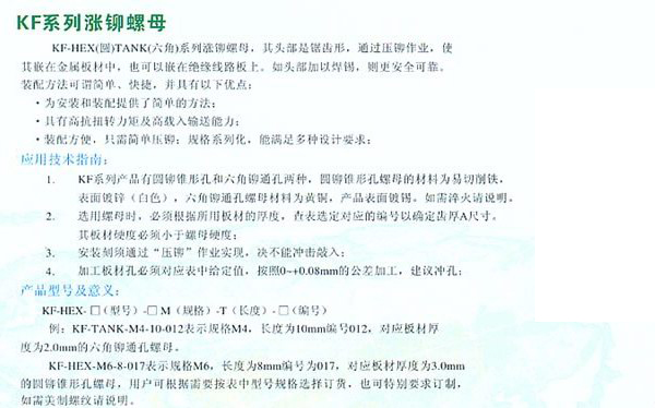 擠壓螺母(型號:KF(KFS))內螺紋緊固件,用于裝配PC版。螺紋尺寸#2到#10和M2和M5,廣泛應用于工業行業,螺母是將機械設備緊密連接起來的零件,通過內側的螺紋,同等規格螺母和螺栓才能連接在一起。