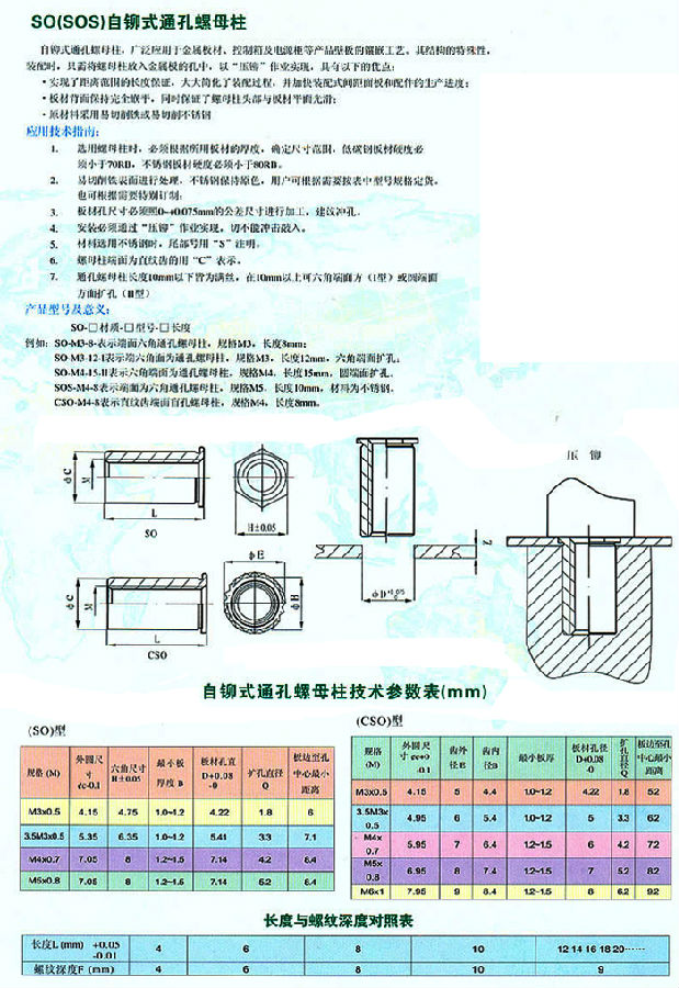 SO(SOS)壓鉚螺母柱廣泛應用于金屬板材、控制箱及電源柜等產品壁板的鑲嵌工藝。其結構的特殊性,裝配時,只需將螺母柱放入金屬板的孔中,